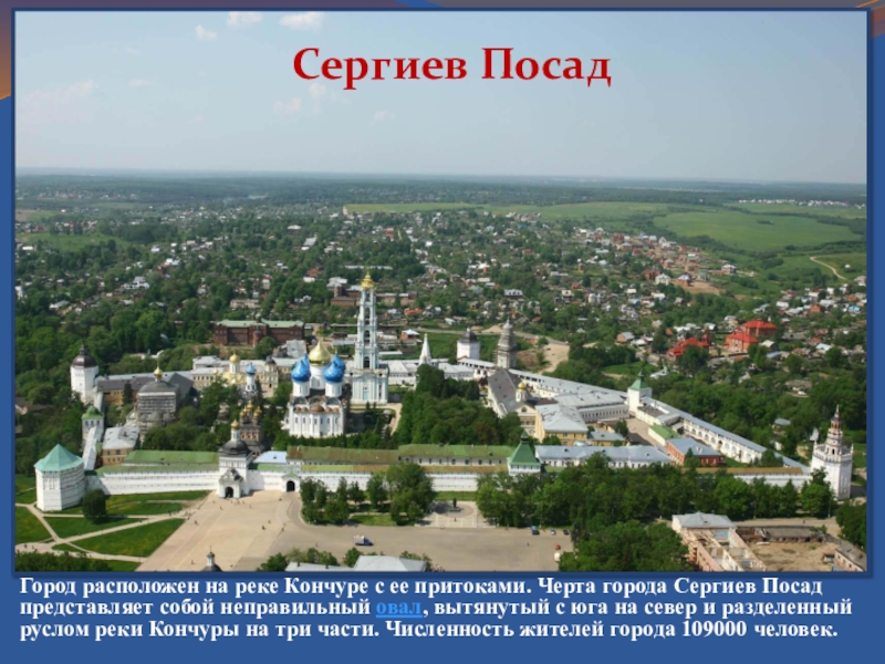 Сергиев Посад представляет собой неправильный овал, вытянутый с юга на север и разделенный руслом реки Кончуры на три части. Численность жителей города 109000 человек.
