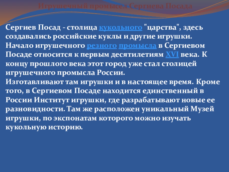 Изготавливают там игрушки и в настоящее время. Кроме того, в Сергиевом Посаде находится единственный в России Институт игрушки, где разрабатывают новые ее разновидности. Там же расположен уникальный Музей игрушки, по экспонатам которого можно изучать кукольную историю.