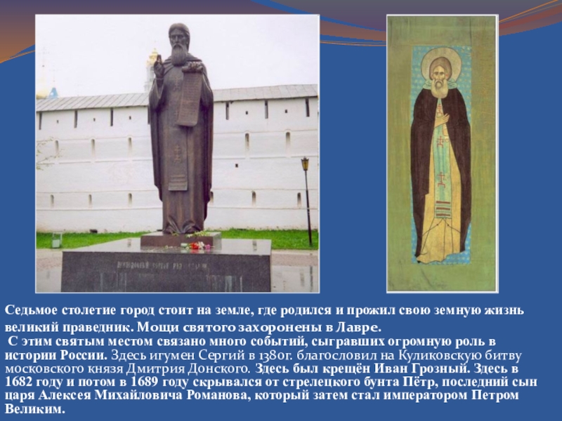 1337 г.) как уединенная пустынь сыновьями ростовского боярина Кирилла Варфоломеем и Стефаном. Варфоломей, принявший вскоре монашеское пострижение с именем Сергий, вошел в историю России как сподвижник московских князей в деле объединения разрозненных русских земель, но, в первую очередь, как инок, проповедовавший и воплощавший в жизни идеи не стяжательства и трудолюбия. Духовный центр России, жемчужина Золотого кольца город Сергиев Посад назван в честь Преподобного Сергия Радонежского, ставшего символом единства и возрождения Русского государства и основавшего в середине ХIV века Троицкий монастырь.