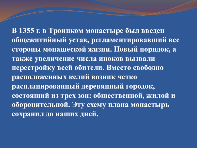 В 1355 г. в Троицком монастыре был введен общежитийный устав, регламентировавший