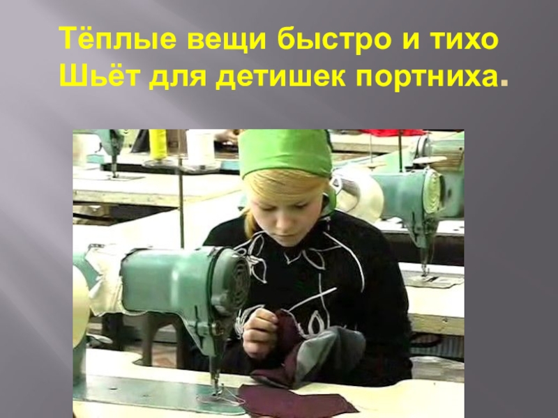 Слайд 9Тёплые вещи быстро и тихо Шьёт для детишек портниха.