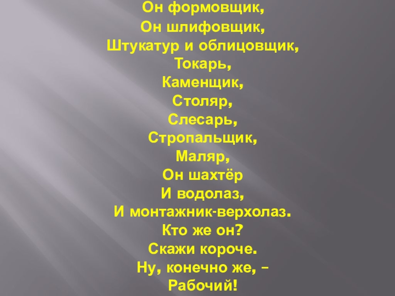 Слесарь, Стропальщик, Маляр, Он шахтёр И водолаз, И монтажник-верхолаз. Кто же он? Скажи короче. Ну, конечно же, – Рабочий!