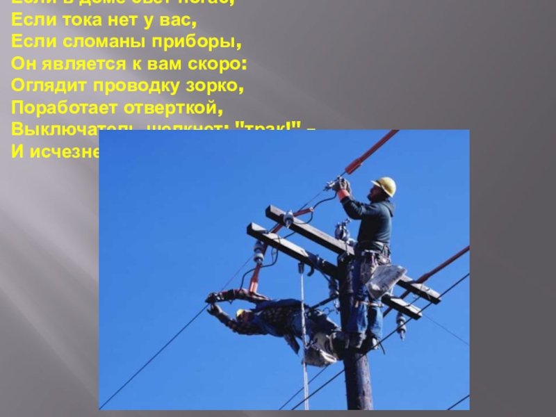 Слайд 12Электрик Если в доме свет погас, Если тока нет у вас,