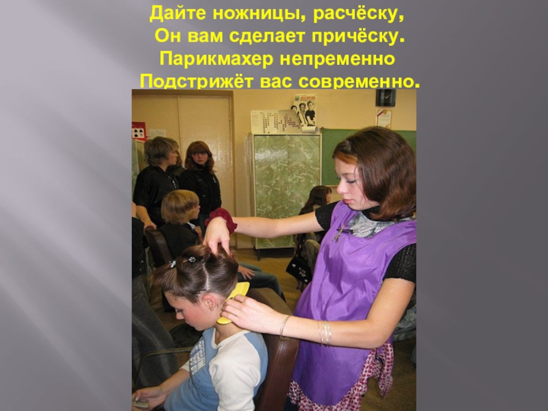 Дайте ножницы, расчёску,  Он вам сделает причёску. Парикмахер непременно  Подстрижёт вас современно.