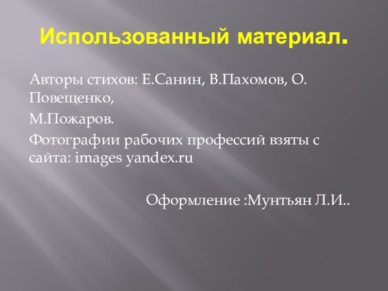 Использованный материал.Авторы стихов: Е.Санин, В.Пахомов, О.Повещенко,М.Пожаров.Фотографии рабочих профессий взяты с сайта: images yandex.ru