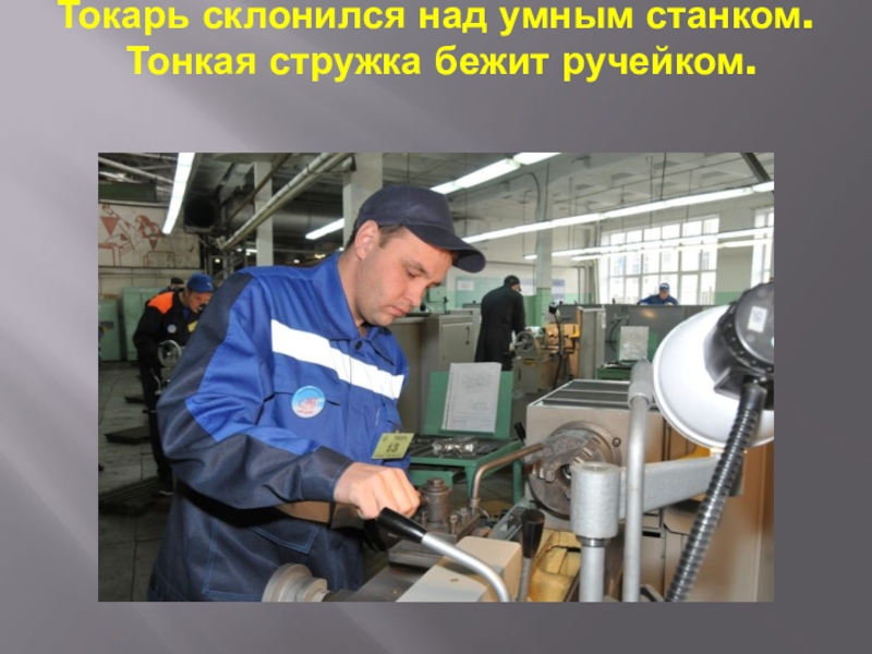 Слайд 13Токарь склонился над умным станком. Тонкая стружка бежит ручейком.