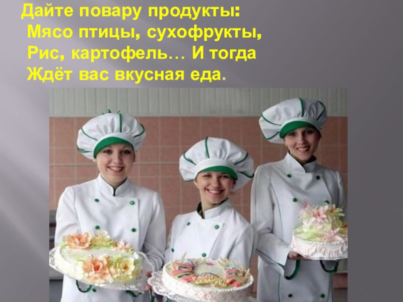 Дайте повару продукты:  Мясо птицы, сухофрукты,  Рис, картофель… И тогда  Ждёт вас вкусная еда.