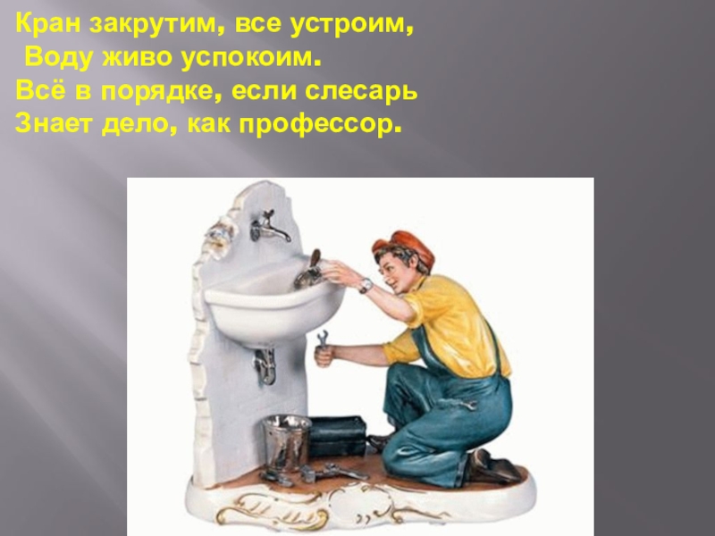Кран закрутим, все устроим,  Воду живо успокоим. Всё в порядке, если слесарь Знает дело, как профессор.