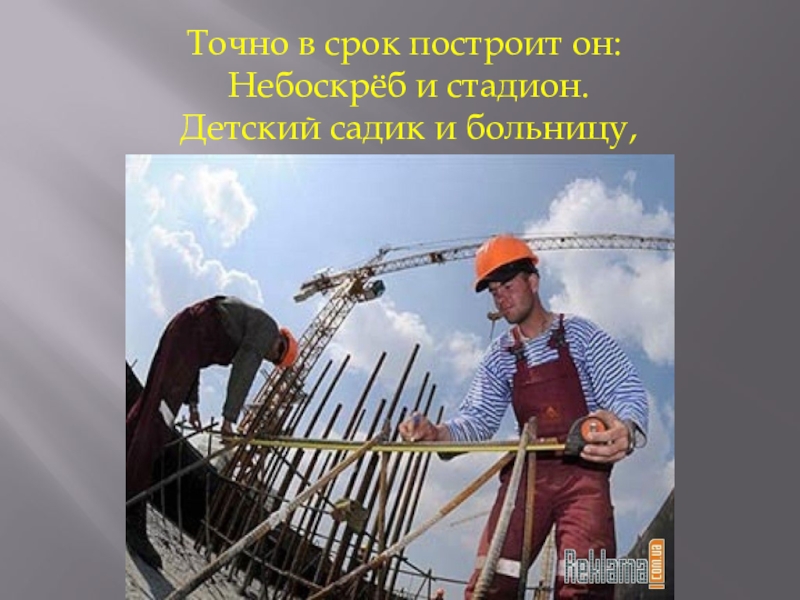 Точно в срок построит он: Небоскрёб и стадион. Детский садик и больницу, Магазинов вереницу.