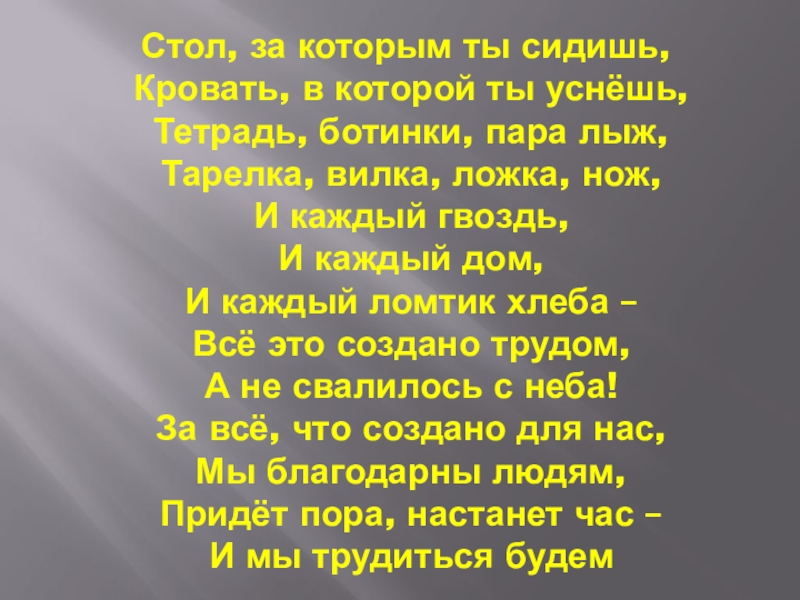ботинки, пара лыж, Тарелка, вилка, ложка, нож, И каждый гвоздь, И каждый дом, И каждый ломтик хлеба – Всё это создано трудом, А не свалилось с неба! За всё, что создано для нас, Мы благодарны людям, Придёт пора, настанет час – И мы трудиться будем