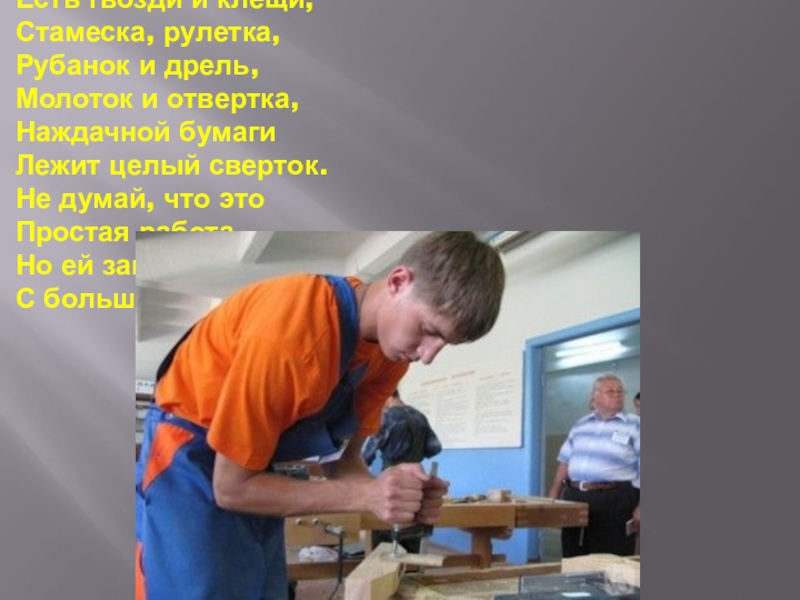 рулетка, Рубанок и дрель, Молоток и отвертка, Наждачной бумаги Лежит целый сверток. Не думай, что это Простая работа, Но ей занимаюсь С большою охотой.