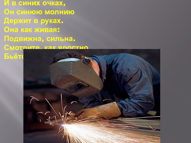 Слайд 14 Сварщик Он в синей спецовке И в синих очках, Он