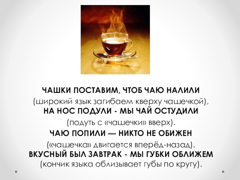 («чашечка» двигается вперёд-назад). ВКУСНЫЙ БЫЛ ЗАВТРАК - МЫ ГУБКИ ОБЛИЖЕМ (кончик языка облизывает губы по кругу).