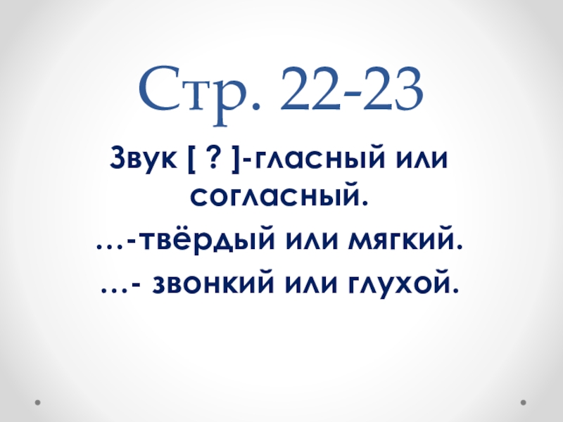 Стр. 22-23Звук [ ? ]-гласный или согласный.…-твёрдый или мягкий.…- звонкий или глухой.