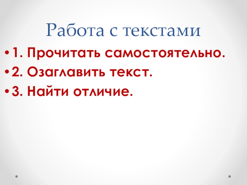 Работа с текстами1. Прочитать самостоятельно.2. Озаглавить текст.3. Найти отличие.