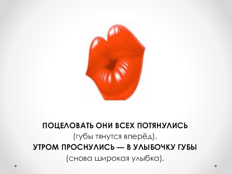 ПОЦЕЛОВАТЬ ОНИ ВСЕХ ПОТЯНУЛИСЬ (губы тянутся вперёд). УТРОМ ПРОСНУЛИСЬ — В УЛЫБОЧКУ ГУБЫ (снова широкая улыбка).