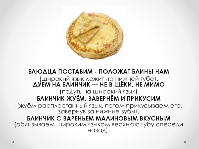 БЛЮДЦА ПОСТАВИМ - ПОЛОЖАТ БЛИНЫ НАМ (широкий язык лежит на нижней губе).  ДУЕМ НА БЛИНЧИК —