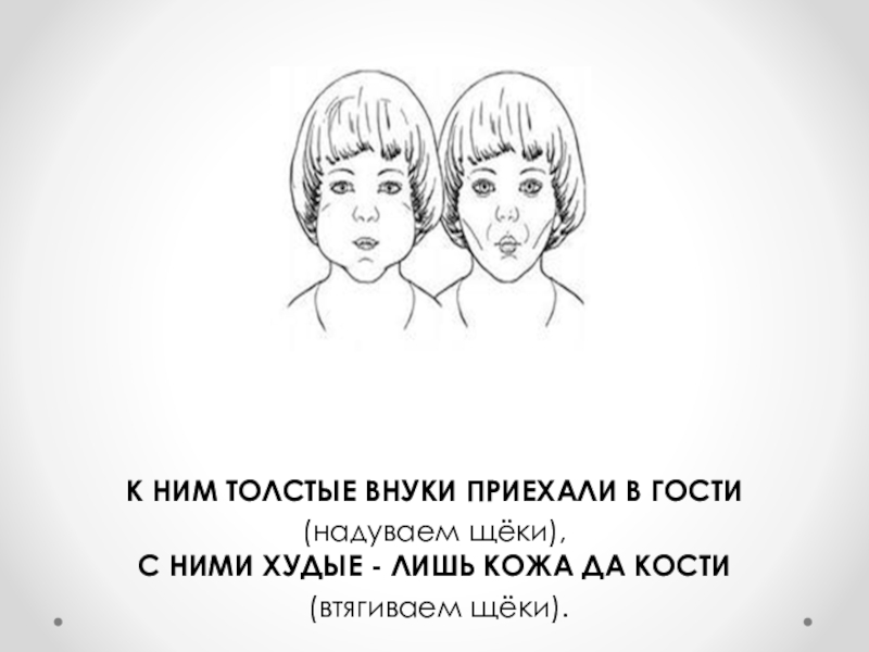 К НИМ ТОЛСТЫЕ ВНУКИ ПРИЕХАЛИ В ГОСТИ (надуваем щёки), С НИМИ ХУДЫЕ - ЛИШЬ КОЖА ДА КОСТИ (втягиваем щёки).