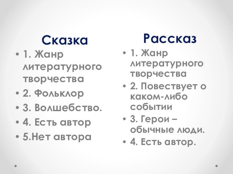 СказкаРассказ 1. Жанр литературного творчества2. Фольклор3. Волшебство.4. Есть автор5.Нет автора1. Жанр литературного творчества2. Повествует о каком-либо
