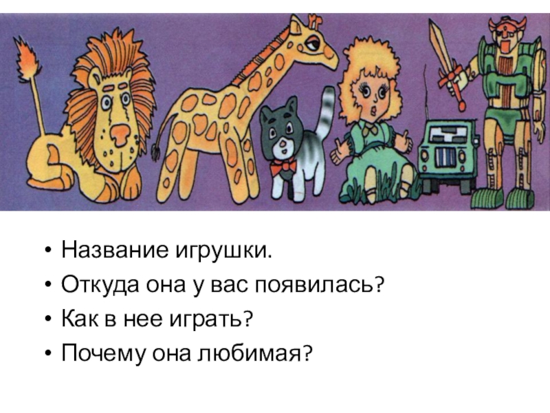 Название игрушки.Откуда она у вас появилась?Как в нее играть?Почему она любимая?