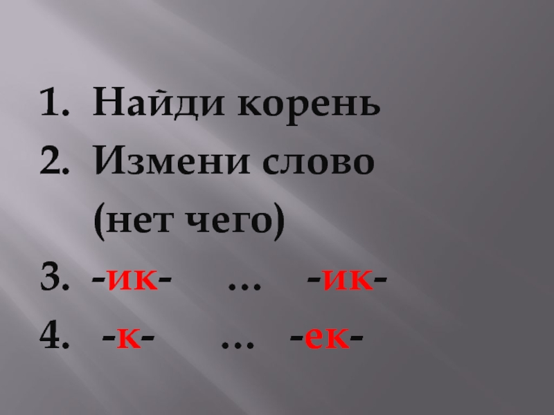 1. Найди корень2. Измени слово   (нет чего) 3. -ик-   …  -ик-4.