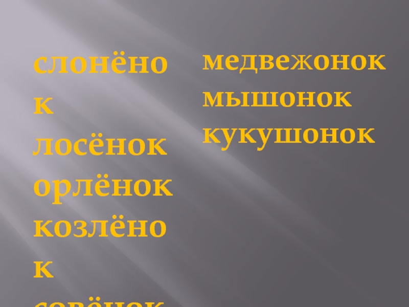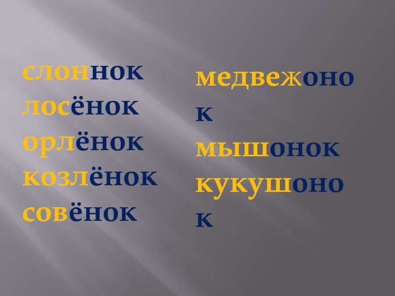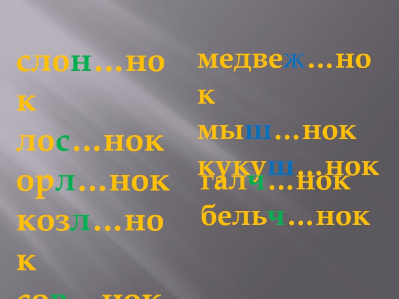 слонёноклосёнокорлёноккозлёноксовёнокмедвежонокмышоноккукушонокгалч…нокбельч…нок