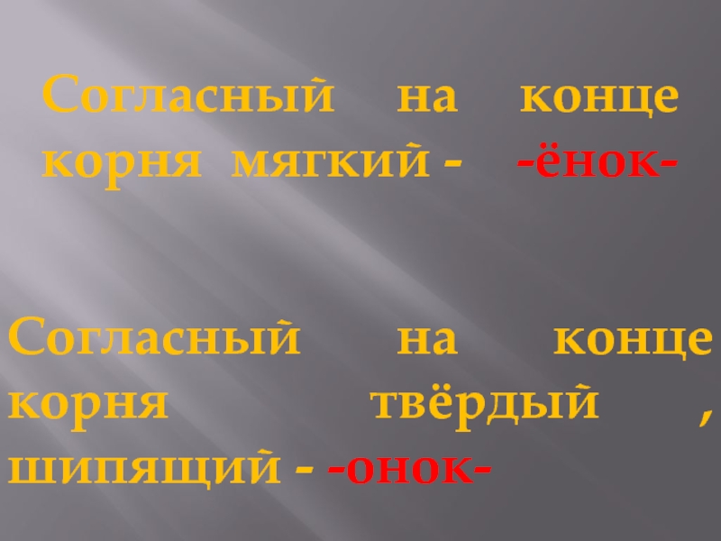 Согласный на конце корня мягкий -  -ёнок-Согласный на конце корня твёрдый , шипящий - -онок-