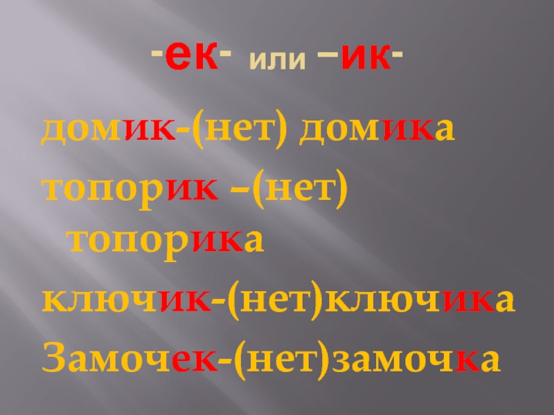 -ек- или –ик-домик-(нет) домикатопорик –(нет)топорикаключик-(нет)ключикаЗамочек-(нет)замочка