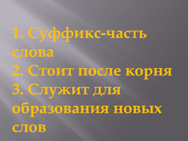 1. Суффикс-часть слова2. Стоит после корня3. Служит для образования новых слов