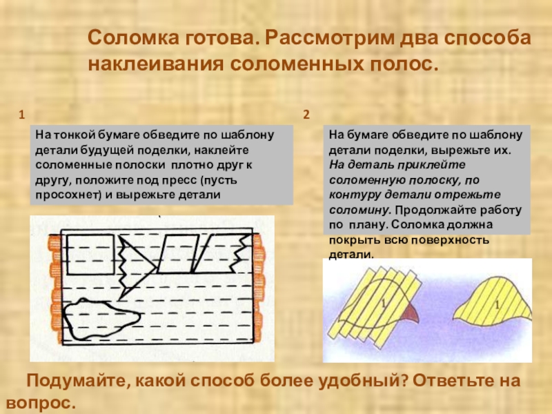 На бумаге обведите по шаблону детали поделки, вырежьте их. На деталь приклейте соломенную полоску, по контуру детали отрежьте соломину. Продолжайте работу по плану. Соломка должна покрыть всю поверхность детали.