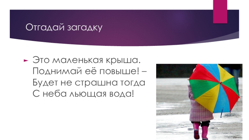 Отгадай загадку Это маленькая крыша. Поднимай её повыше! – Будет не страшна тогда С неба льющая вода!