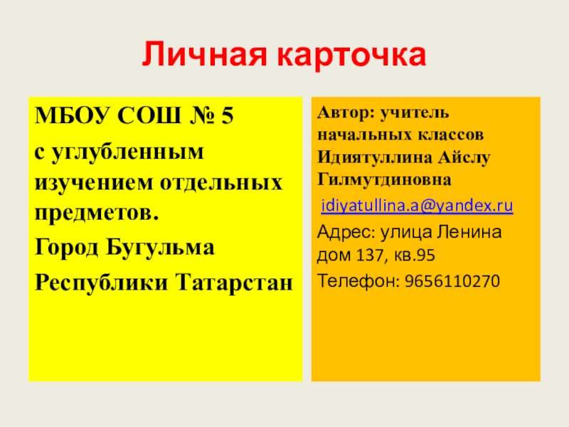 Личная карточкаМБОУ СОШ № 5с углубленным изучением отдельных предметов.Город БугульмаРеспублики Татарстан Автор: учитель начальных классов Идиятуллина Айслу Гилмутдиновна