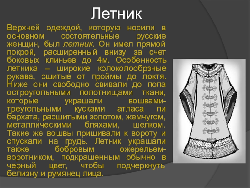 Верхней одеждой, которую носили в основном состоятельные русские женщин, был летник.