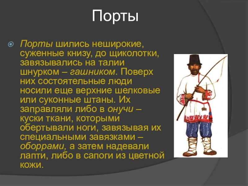 Порты шились неширокие, суженные книзу, до щиколотки, завязывались на талии шнурком