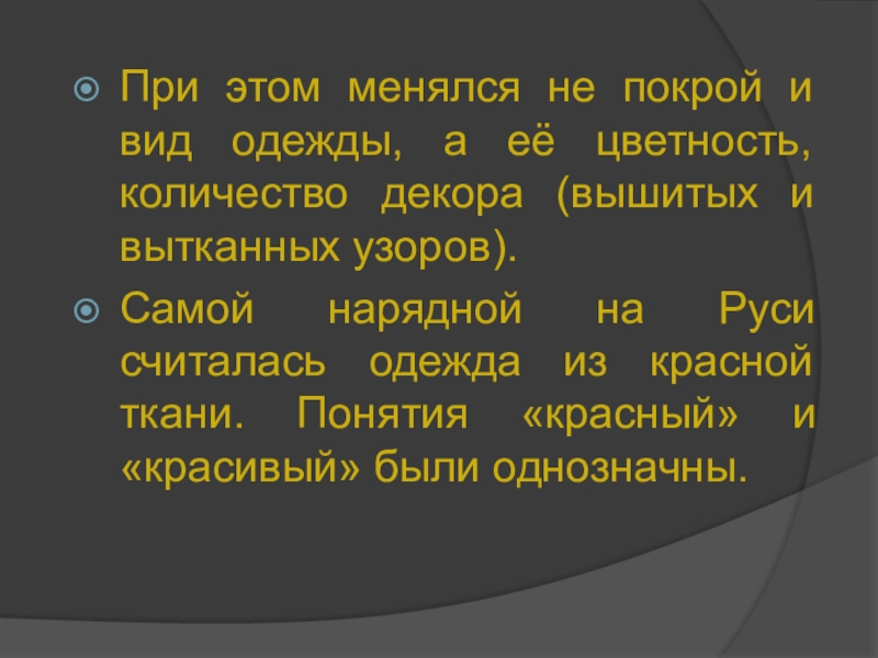 Самой нарядной на Руси считалась одежда из красной ткани. Понятия «красный» и «красивый» были однозначны.