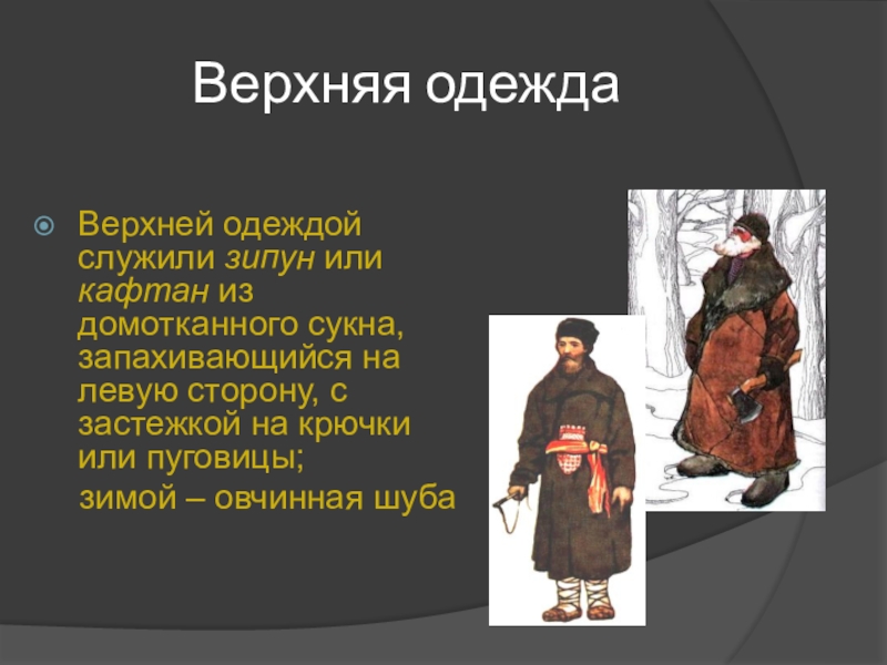 Верхней одеждой служили зипун или кафтан из домотканного сукна,
