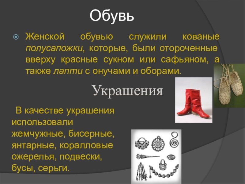 Женской обувью служили кованые полусапожки, которые, были отороченные вверху красные сукном