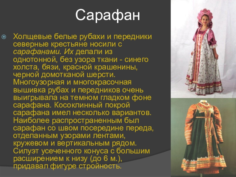 делали из однотонной, без узора ткани - синего холста, бязи, красной крашенины, черной домотканой шерсти. Многоузорная и многокрасочная вышивка рубах и передников очень выигрывала на темном гладком фоне сарафана. Косоклинный покрой сарафана имел несколько вариантов. Наиболее распространенным был сарафан со швом посередине переда, отделанным узорами лентами, кружевом и вертикальным рядом. Силуэт усеченного конуса с большим расширением к низу (до 6 м.), придавал фигуре стройность.