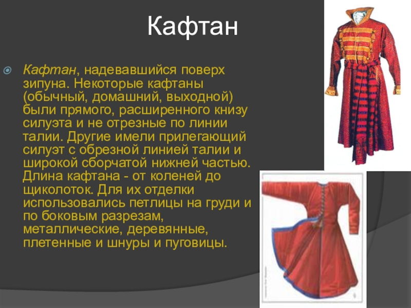 прямого, расширенного книзу силуэта и не отрезные по линии талии. Другие имели прилегающий силуэт с обрезной линией талии и широкой сборчатой нижней частью. Длина кафтана - от коленей до щиколоток. Для их отделки использовались петлицы на груди и по боковым разрезам, металлические, деревянные, плетенные и шнуры и пуговицы.