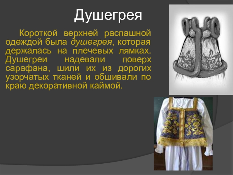 на плечевых лямках. Душегреи надевали поверх сарафана, шили их из дорогих узорчатых тканей и обшивали по краю декоративной каймой.