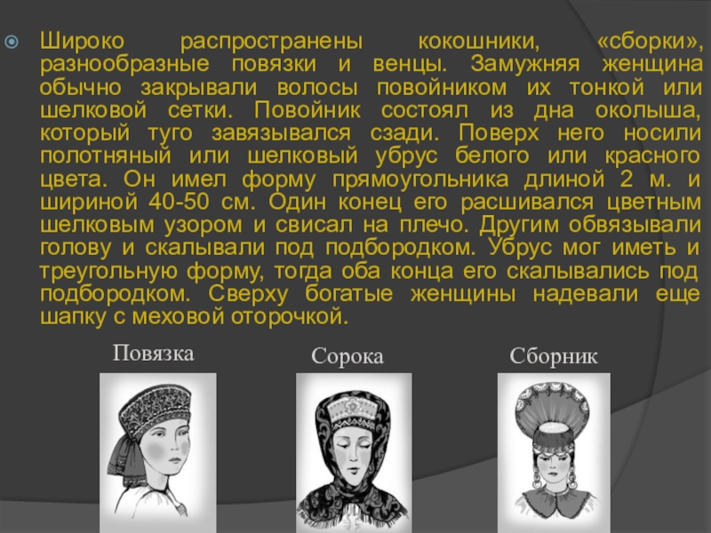 закрывали волосы повойником их тонкой или шелковой сетки. Повойник состоял из дна околыша, который туго завязывался сзади. Поверх него носили полотняный или шелковый убрус белого или красного цвета. Он имел форму прямоугольника длиной 2 м. и шириной 40-50 см. Один конец его расшивался цветным шелковым узором и свисал на плечо. Другим обвязывали голову и скалывали под подбородком. Убрус мог иметь и треугольную форму, тогда оба конца его скалывались под подбородком. Сверху богатые женщины надевали еще шапку с меховой оторочкой.