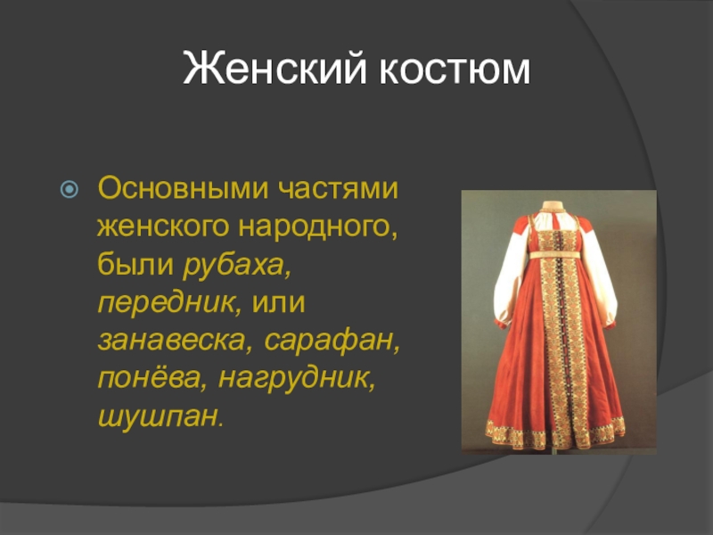 Основными частями женского народного, были рубаха, передник, или занавеска, сарафан,