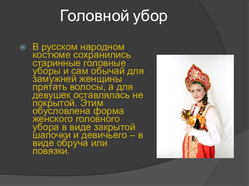 В русском народном костюме сохранились старинные головные уборы и сам