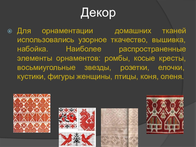 Для орнаментации домашних тканей использовались узорное ткачество, вышивка, набойка. Наиболее распространенные