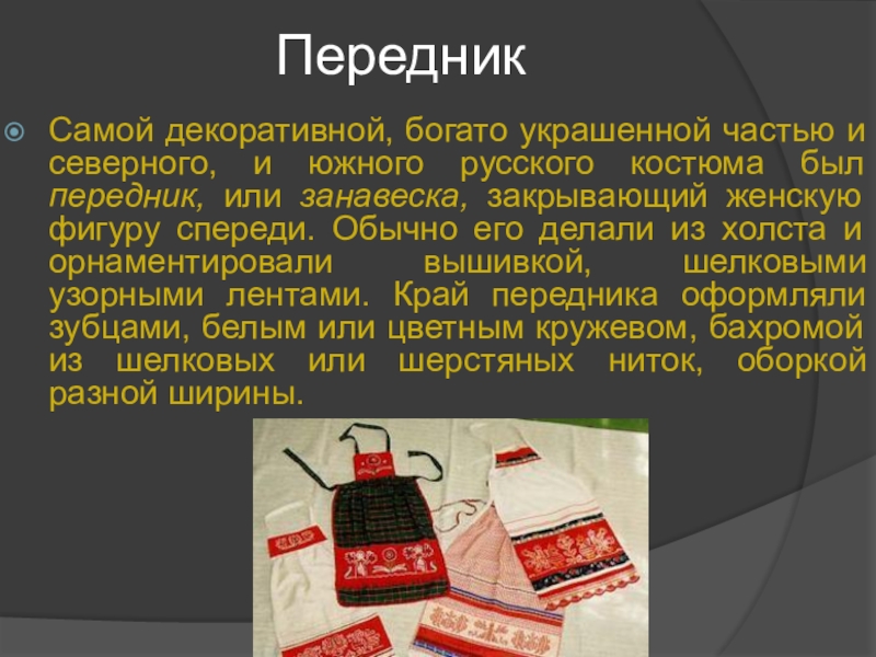 был передник, или занавеска, закрывающий женскую фигуру спереди. Обычно его делали из холста и орнаментировали вышивкой, шелковыми узорными лентами. Край передника оформляли зубцами, белым или цветным кружевом, бахромой из шелковых или шерстяных ниток, оборкой разной ширины.