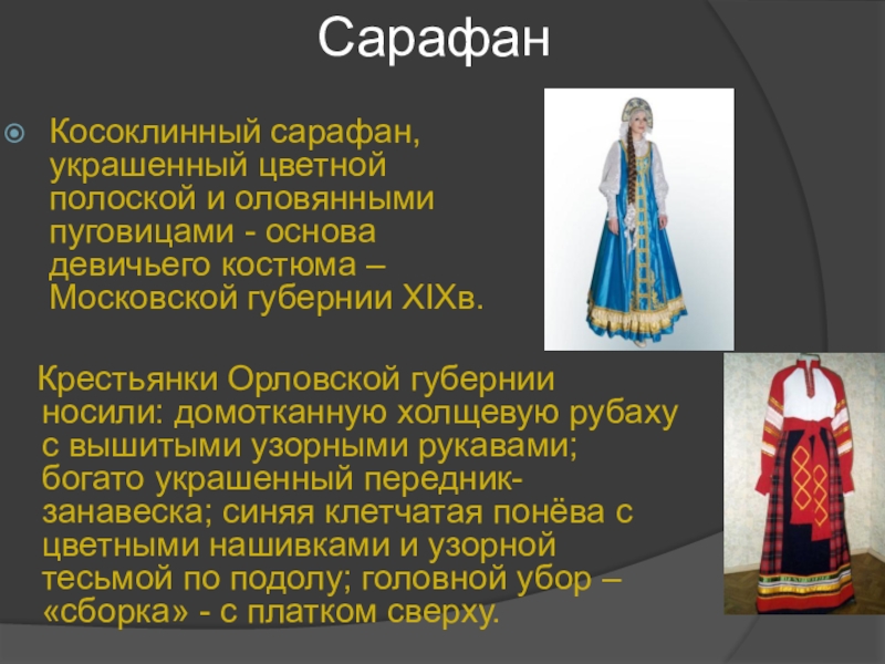 Крестьянки Орловской губернии носили: домотканную холщевую рубаху с вышитыми узорными рукавами; богато украшенный передник-занавеска; синяя клетчатая понёва с цветными нашивками и узорной тесьмой по подолу; головной убор – «сборка» - с платком сверху.