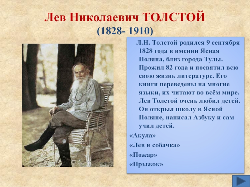 года в имении Ясная Поляна, близ города Тулы. Прожил 82 года и посвятил всю свою жизнь литературе. Его книги переведены на многие языки, их читают во всём мире. Лев Толстой очень любил детей. Он открыл школу в Ясной Поляне, написал Азбуку и сам учил детей.