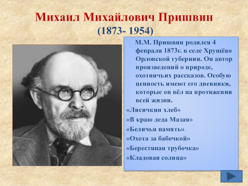февраля 1873г. в селе Хрущёво Орловской губернии. Он автор произведений о природе, охотничьих рассказов. Особую ценность имеют его дневники, которые он вёл на протяжении всей жизни.