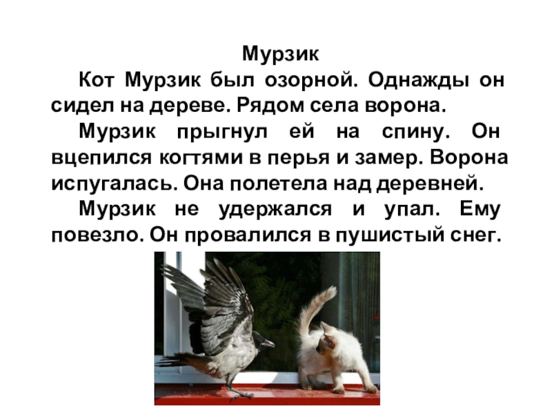 Кот Мурзик был озорной. Однажды он сидел на дереве. Рядом села
