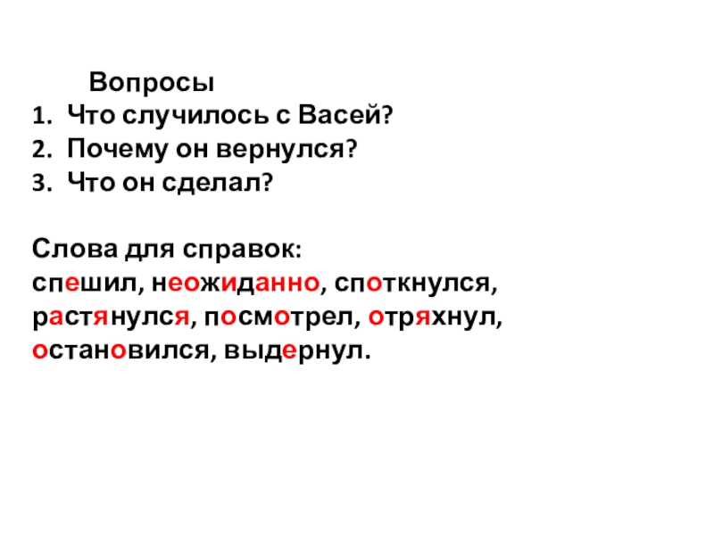 спешил, неожиданно, споткнулся, растянулся, посмотрел, отряхнул, остановился, выдернул.